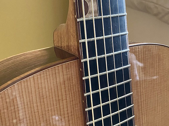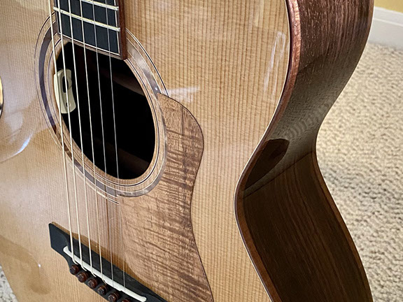 Glutton Orchestra Model (OM) - Example with a torrified Spruce top, figured koa body, neck and headstock binding and accents. It features Schertler tuning machines and a L.R.Baggs Athem SL pickup. List price $3999.