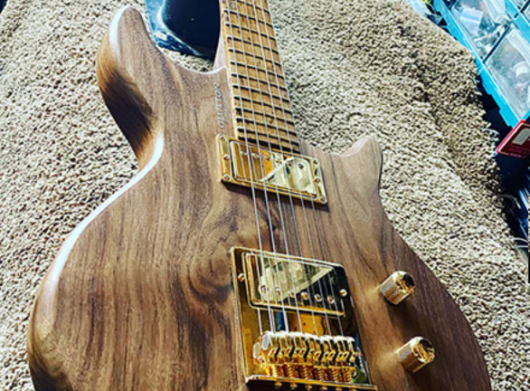 Glutton Lester Model - Example with a solid Walnut neck and body and a roasted maple fretboard. It features a matte finish, gold frets and hardware. Hip Shot locking tuning machines and Parsons' Golden Age Hum-bucking pick ups. List price $1299