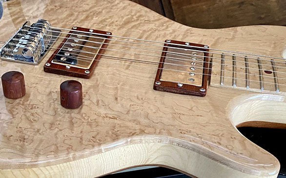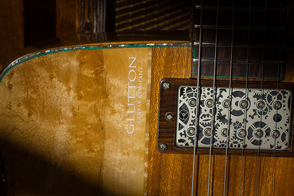 Glutton Lester Model - Example with a Figured Maple fretboard, Padauk headstock veneer and accents, Maple headstock binding with Abalone inlay. It features Hip Shot locking tuning machines and Parsons' Golden Age Hum-bucking pick ups. List price $2399.
