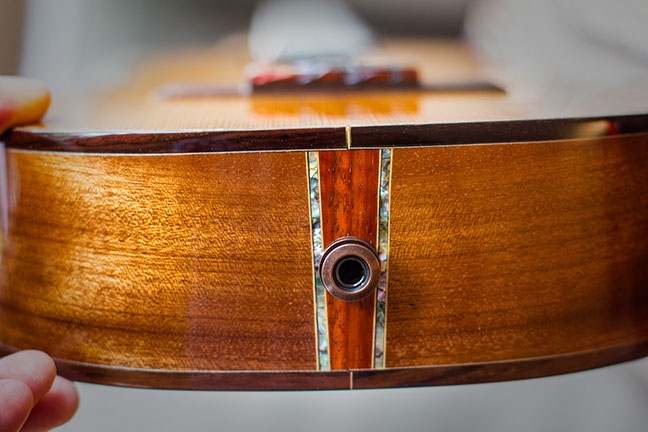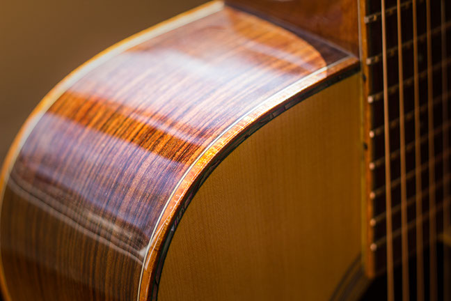 Glutton Orchestra Model (OM) - Example with a torrified Spruce top, figured koa body, neck and headstock binding and accents. It features Schertler tuning machines and a L.R.Baggs Athem SL pickup. List price $3999.