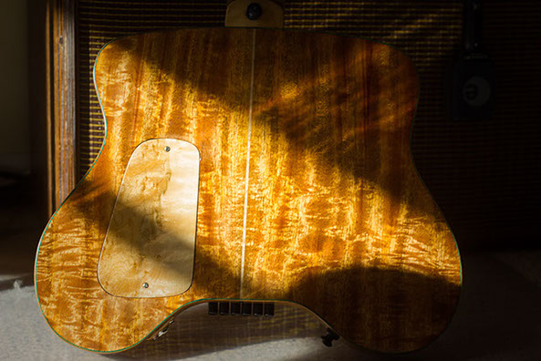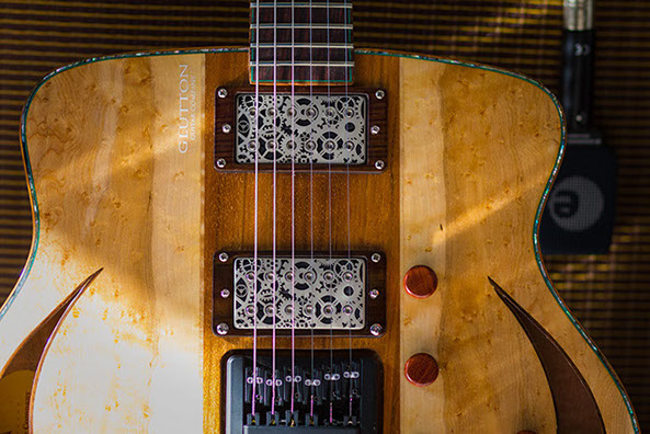 Glutton Ichibod model. This example has a salted maple top with a figured mahogany back and cherry sides and accents. It is bound with figured kowa and includes abalone inlay, premium hardware and electronics. DeMarzio Dark Matter pickups. JCustom head piece and fixed bridge with peizo elements. LR Baggs Control X preamp with the ability to produce both mixed or separated acoustic and magnetic tones. Currently listed for $2450.