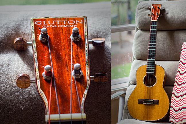 The Glutton Tenor Ukulele features solid mahogany soundboard, back and sides. Light hand sculpted and tuned spruce bracing, premium kerfing allowing for solid construction and wood binding, a mahogany low-profile neck with rosewood fingerboard, unbleached bone nut and saddle. Finished with a light coat of nitrocellulose lacquer. Options include choices of headstock, top, back and binding woods, inlay, fret size, tuning machines and electronics. List prices starting at $699.